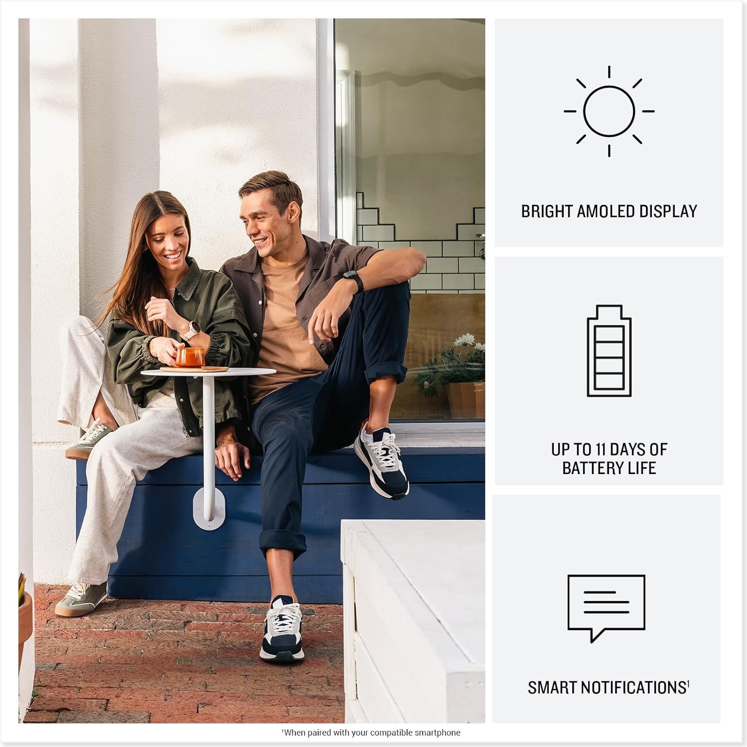 | Vibrant AMOLED display | Requires smartphone pairing for some features |